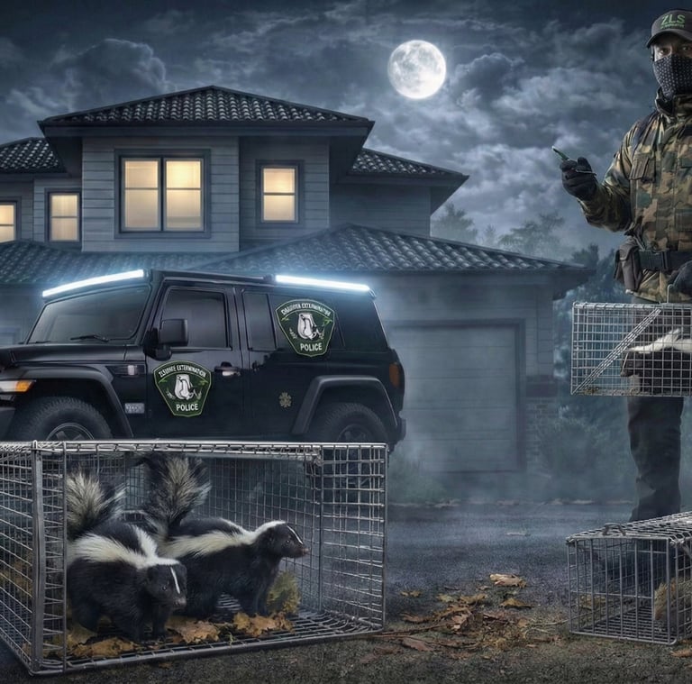 Chez Extermination ZLS, nous sommes spécialisés dans la capture sécuritaire et humanitaire des mouffettes, qu’elles soient seules ou accompagnées de leurs petits. Chaque intervention est planifiée avec soin afin de limiter les risques d’odeur et d’assurer une manipulation respectueuse de l’animal.